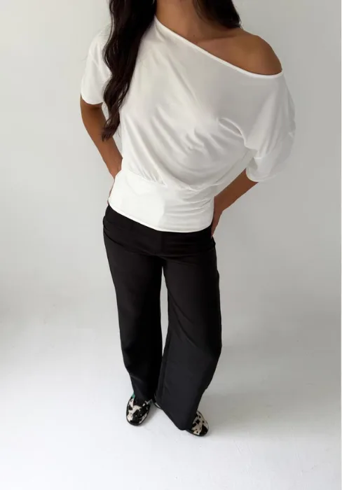 Remera con faja y con un hombro descubierto.