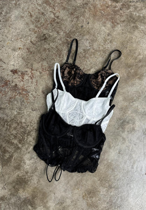 Corset lencero importado con ballenas reforzadas, elástico cruzado en el frente, voladitos de terminación, breteles regulables.