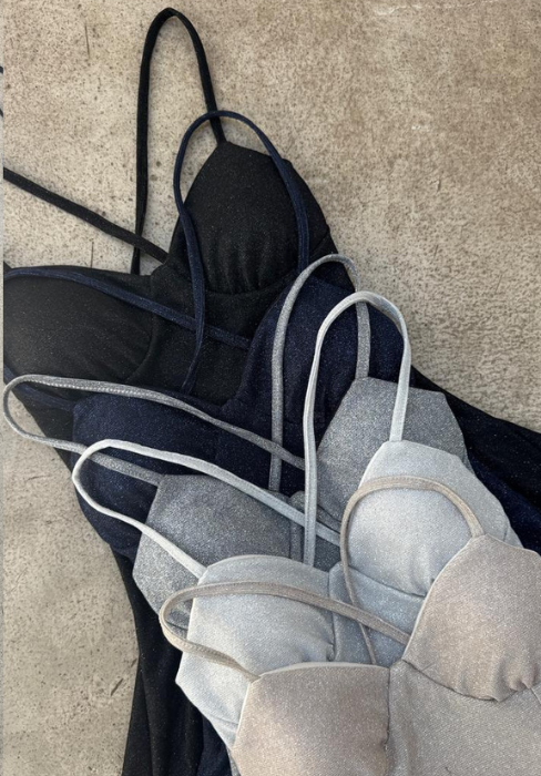 Vestido con tasas, corte plato y espalda con tiras Tela: Glitter