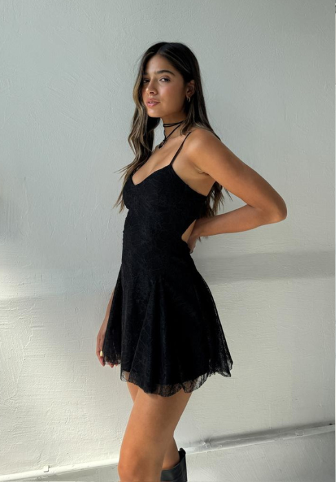 Vestido con tasas, breteles regulables y corte plato Tela: Encaje y forrado.