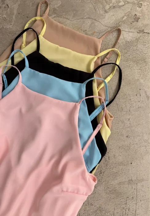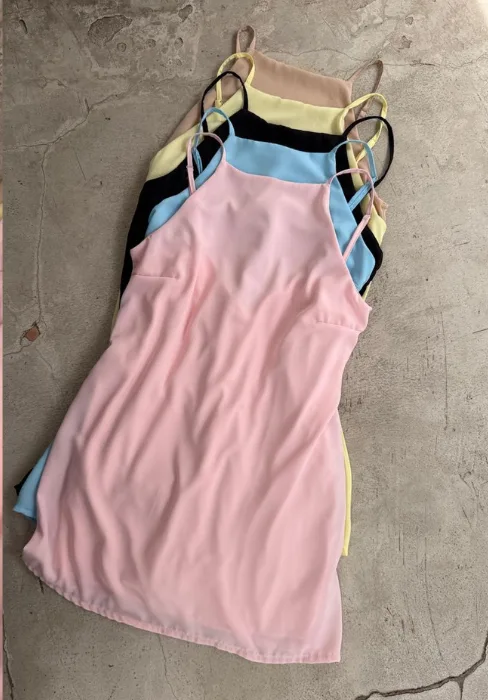 Vestido suelto con escote cerrado y breteles regulables.