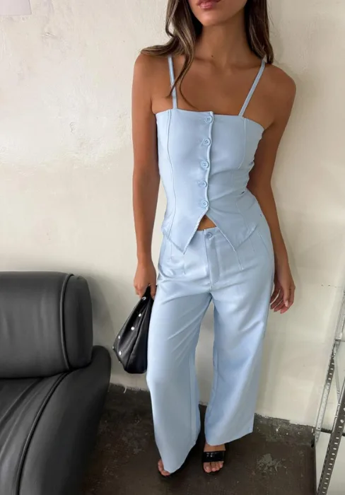 Sastrero corte wide leg con detalles de pinzas y botón.