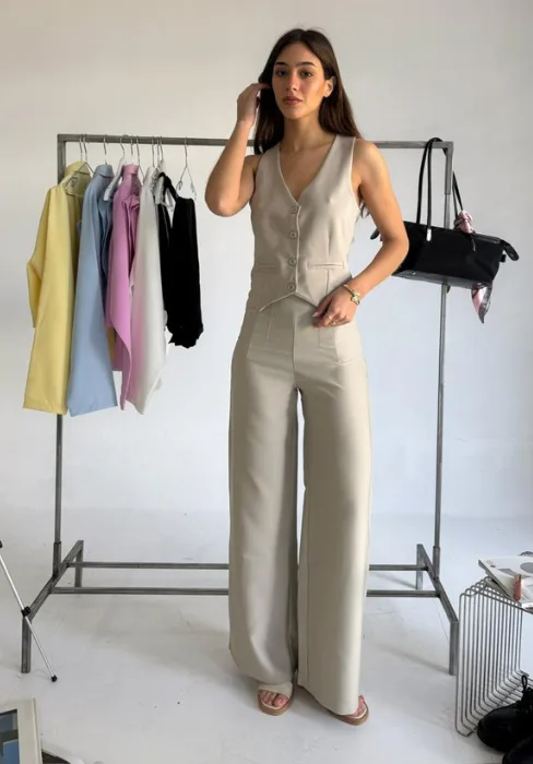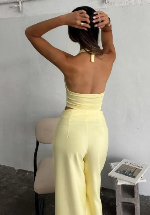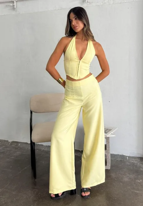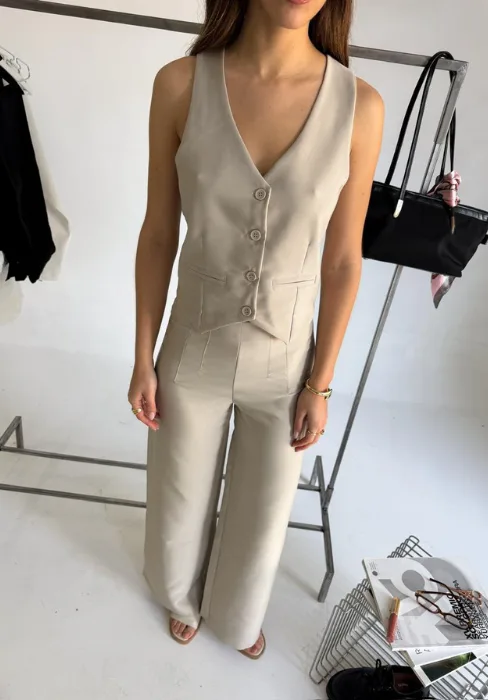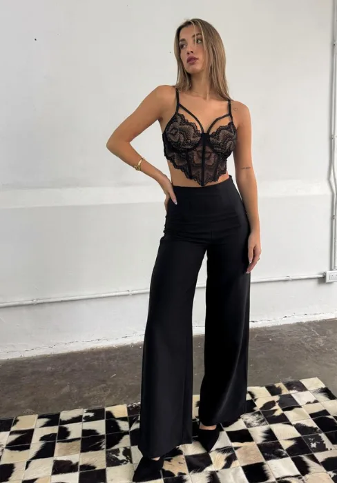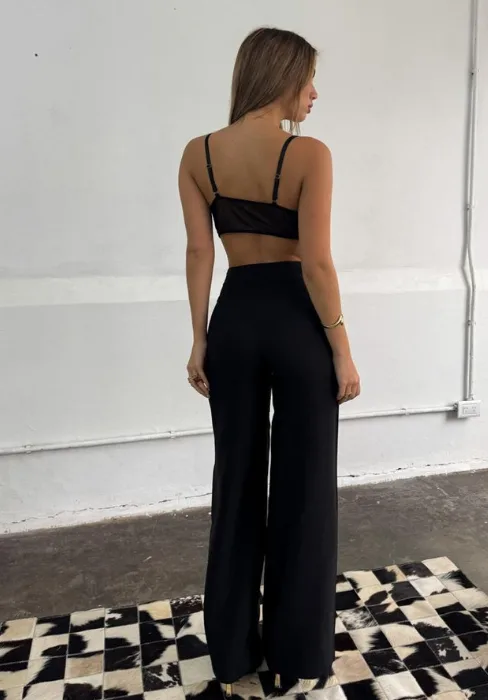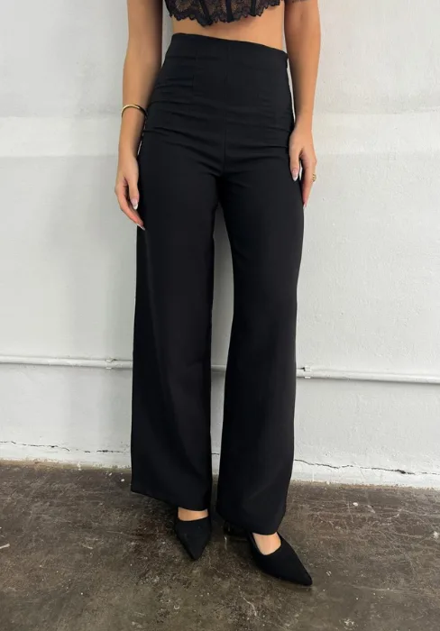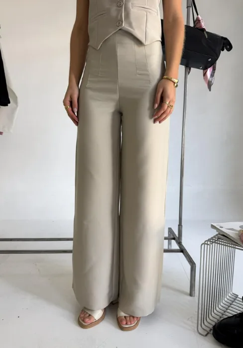 Wide leg con detalle de pinzas en cintura y cierre invisible en lateral.